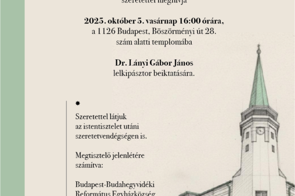 A Budapest-Budahegyvidéki Református Egyházközség szeretettel meghívja 2025. október 5. vasárnap 16:00 órára, a 1126 Budapest, Böszörményi út 28. szám alatti templomába Dr. Lányi Gábor János lelkipásztor beiktatására. Szeretettel látjuk az istentisztelet utáni szeretetvendégségen is. Megtisztelő jelenlétére számítva: Budapest-Budahegyvidéki Református Egyházközség Presbitériuma Igét hirdet: Ft. Balog Zoltán, A Dunamelléki Református...