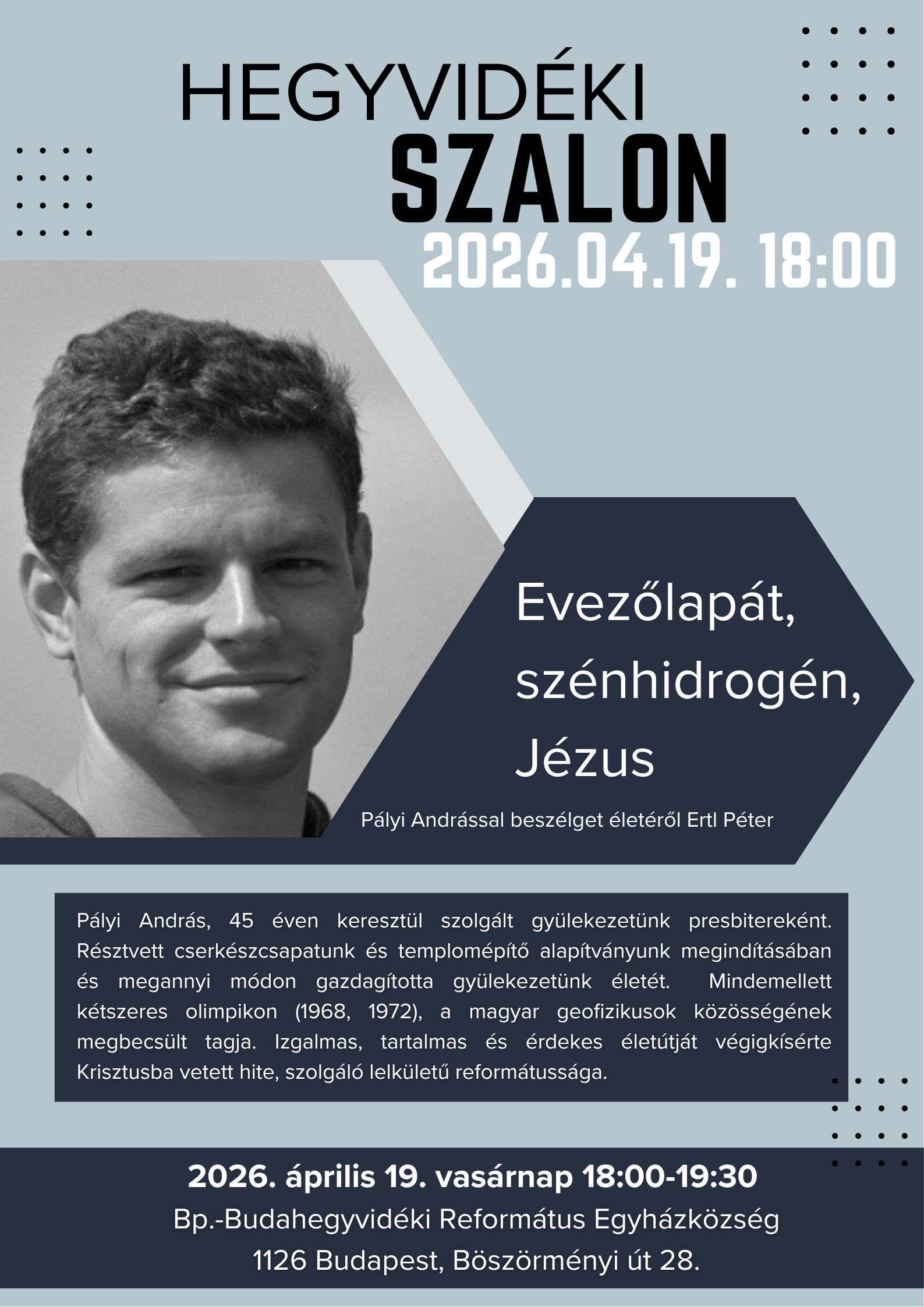 Pályi András, 45 éven keresztül szolgált gyülekezetünk presbitereként. Résztvett cserkészcsapatunk és templomépítő alapítványunk megindításában és megannyi módon gazdagította gyülekezetünk életét. Mindemellett kétszeres olimpikon (1968, 1972), a magyar geofizikusok közösségének megbecsült tagja. Izgalmas, tartalmas és érdekes életútját végigkísérte Krisztusba vetett hite, szolgáló lelkületű reformátussága.
