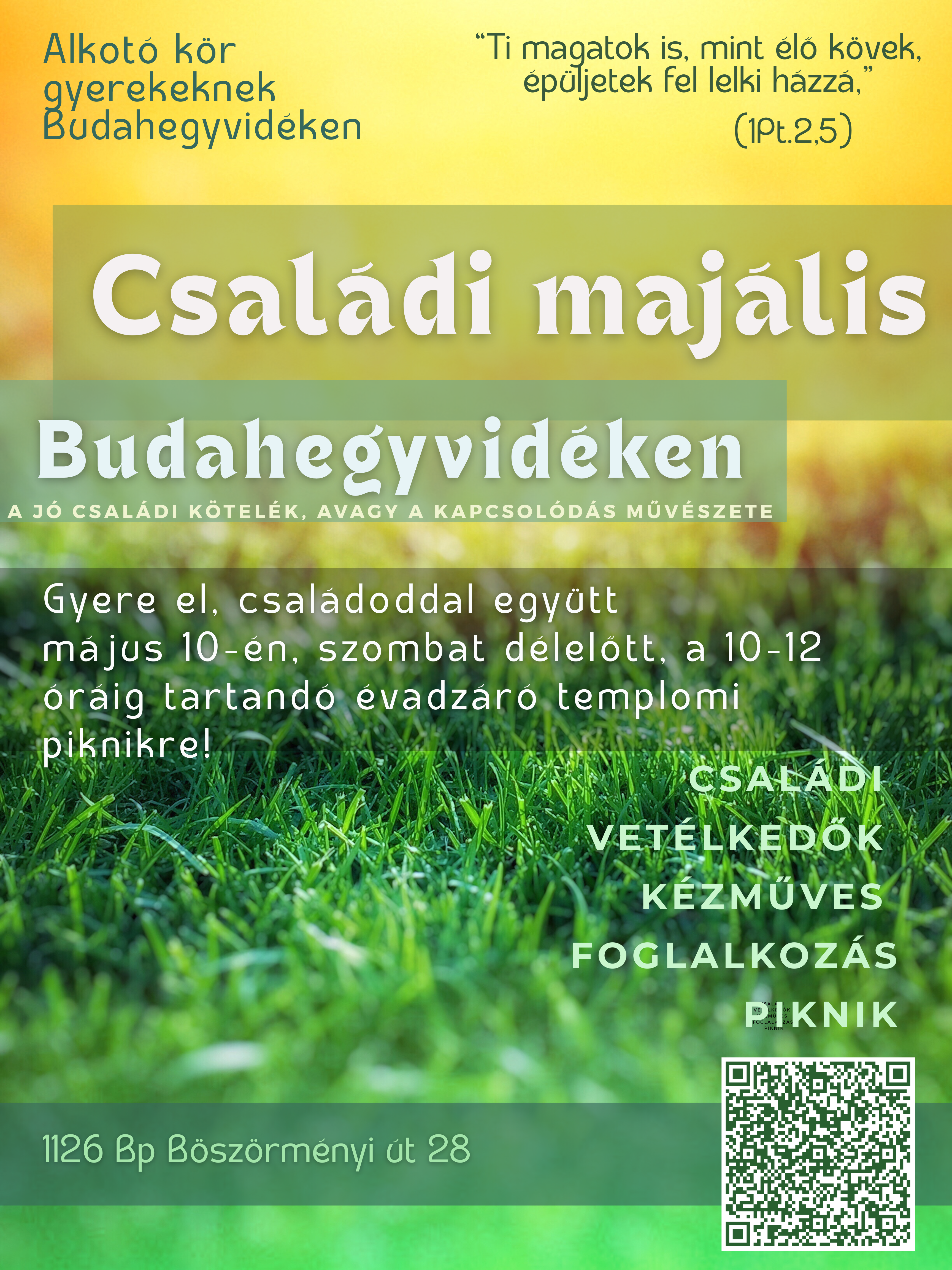 Sok szeretettel hívjuk a családokat közösen, május 10-én délelőtt 10-12-ig tartandó, évadzáró alkotó körünkre: közös játékra, családi vetélkedőre, kézműves foglalkozásokra, kötetlen együttlétre és piknikre.