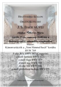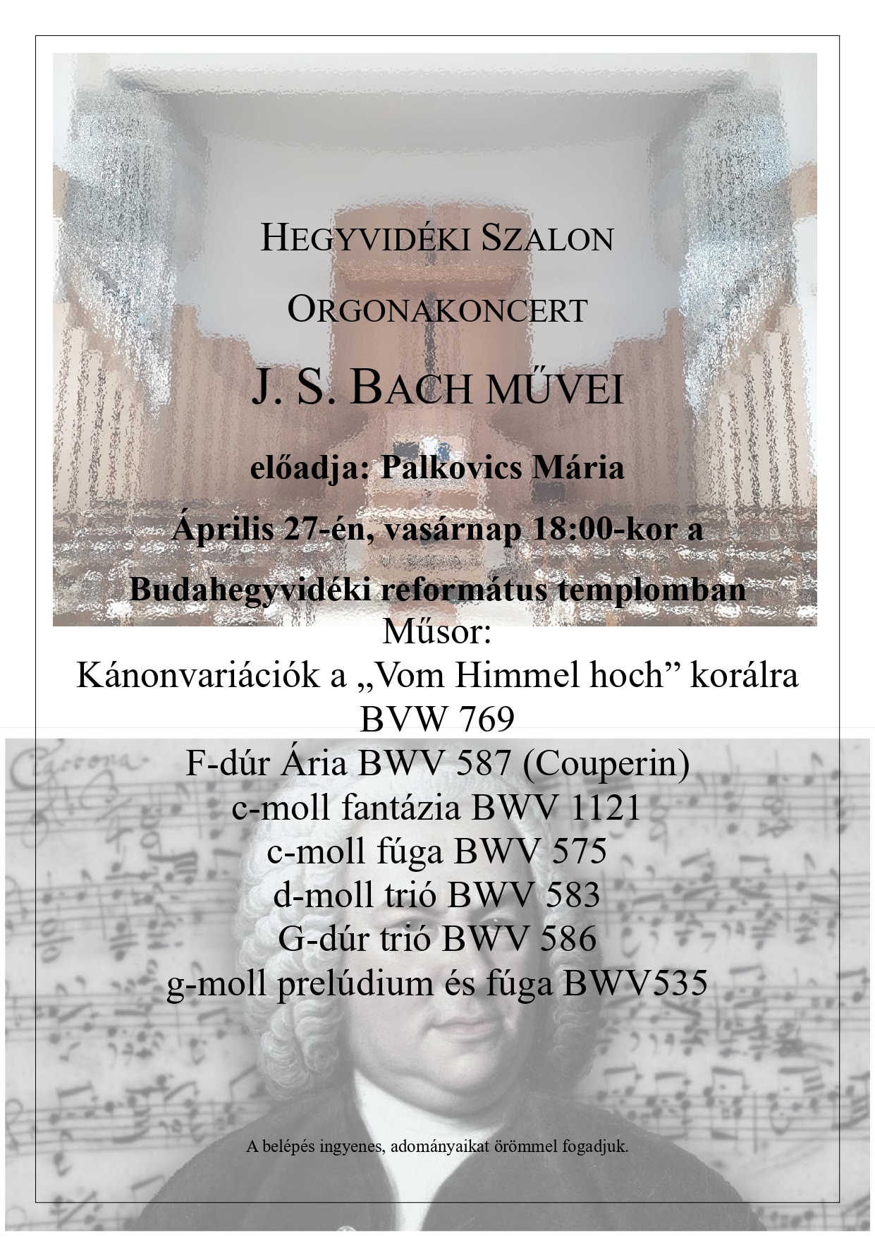 Szeretettel várunk mindenkit a Hegyvidéki Szalon következő alkalmára, amelyen Palkovics Mária orgonaművész szólaltat meg Bach műveket templomunkban 2025. április 27-én vasárnap este 18 órától.